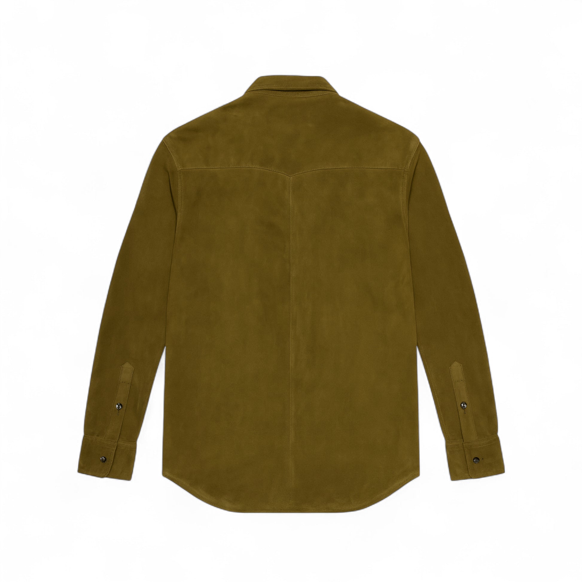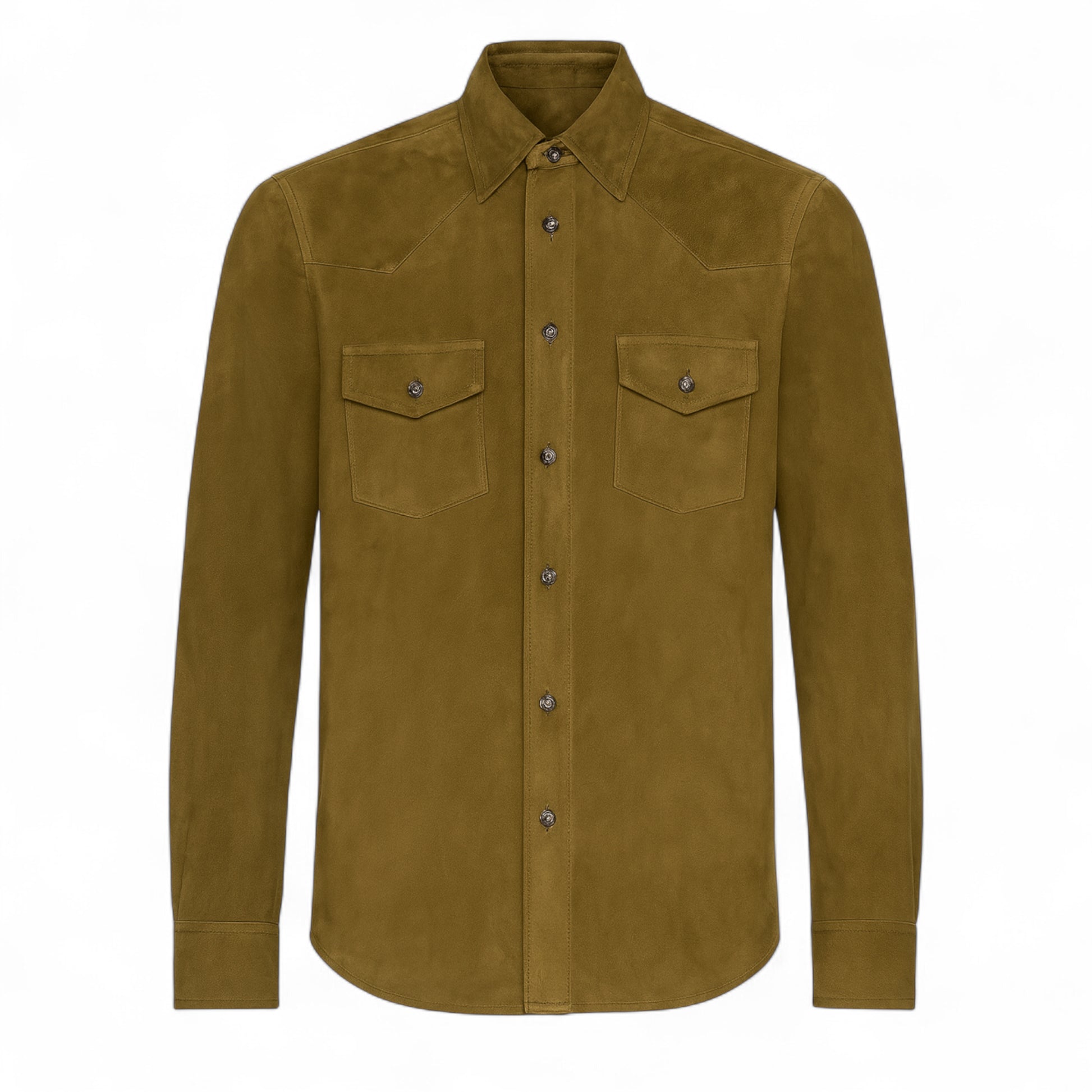 A stylish olive green suede shirt jacket featuring a classic western design, complete with two chest pockets and snap buttons, perfect for a sophisticated yet casual look.